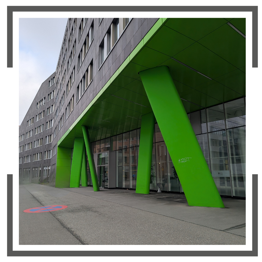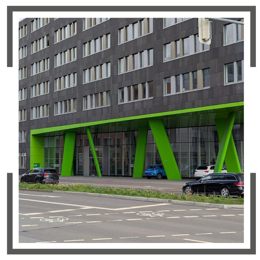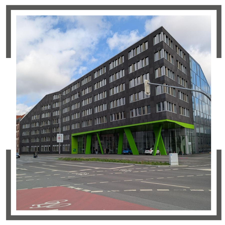 Von den Straßenbahnhaltenstellen (Hauptbahnhof) aus sehen Sie unser Gebäude bereits - halten Sie Ausschau nach den grünen Säulen.